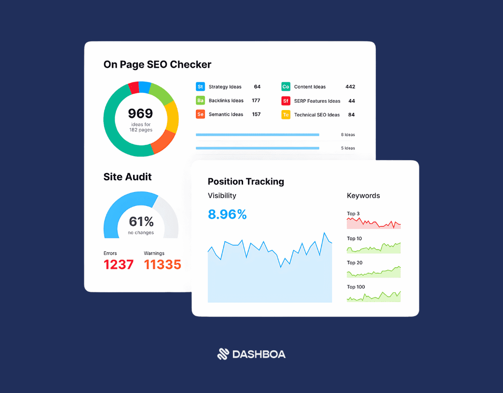 Dashboa suorittaa syvällisiä auditointeja verkkosivustollesi tunnistaakseen teknisiä ongelmia ja seuraa sen suorituskykyä ajan myötä. Automaattiset sijoituksen seurantasovellukset seuraavat avainsanojen suorituskykyä eri hakukoneissa ja tarjoavat reaaliaikaisia näkemyksiä.