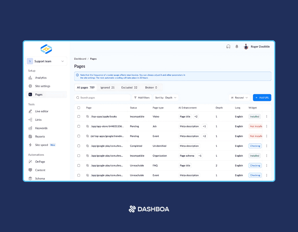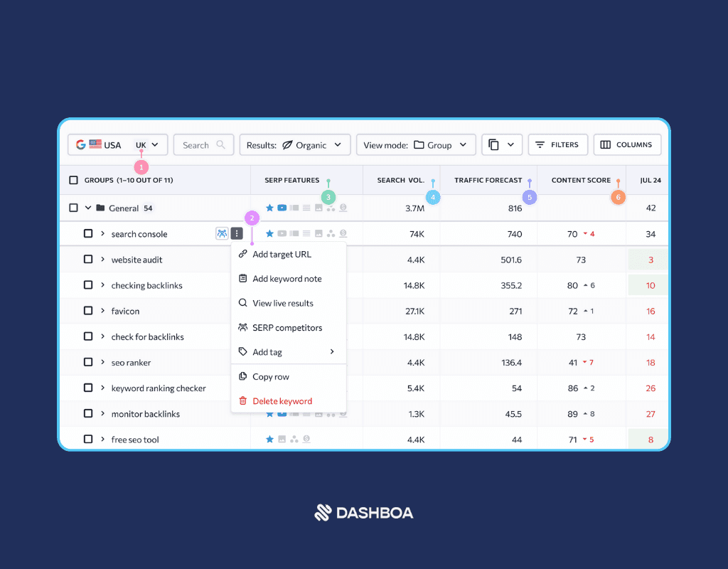 Aloitetaan luettelomme yhdestä parhaasta automaattisesta SEO-työkalusta markkinoilla, Dashboa. Tämän työkalun lukuisat SEO-automaatio-ominaisuudet vievät SEO-strategiasi seuraavalle tasolle.